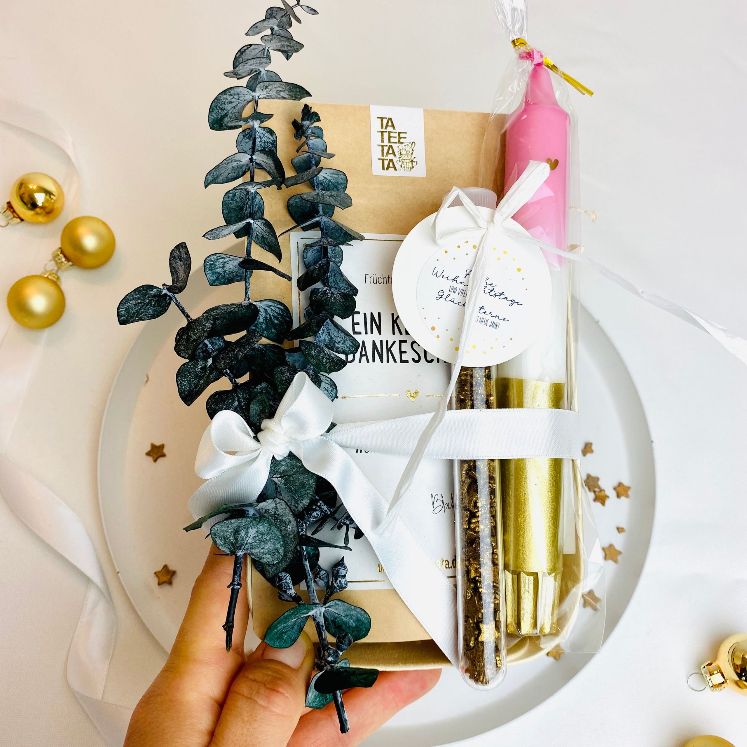 Weihnachtliches Geschenkset | Teemischung & Dip Dye Kerze & goldige Schoko Linsen