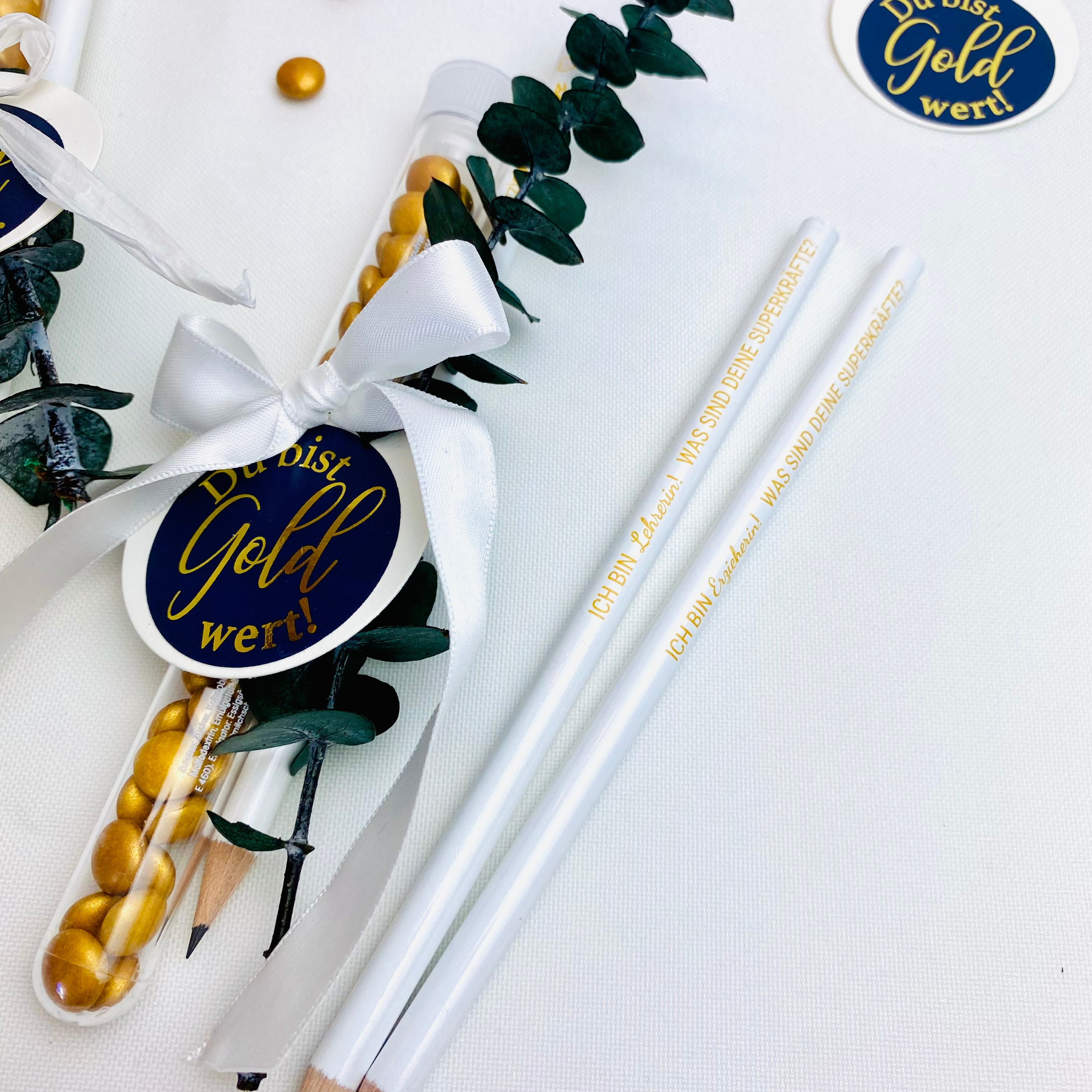 - weißer Bleistift mit goldenem Aufdruck: ICH BIN Lehrerin! WAS SIND DEINE SUPERKRÄFTE? oder Tagesmutter mit Herz