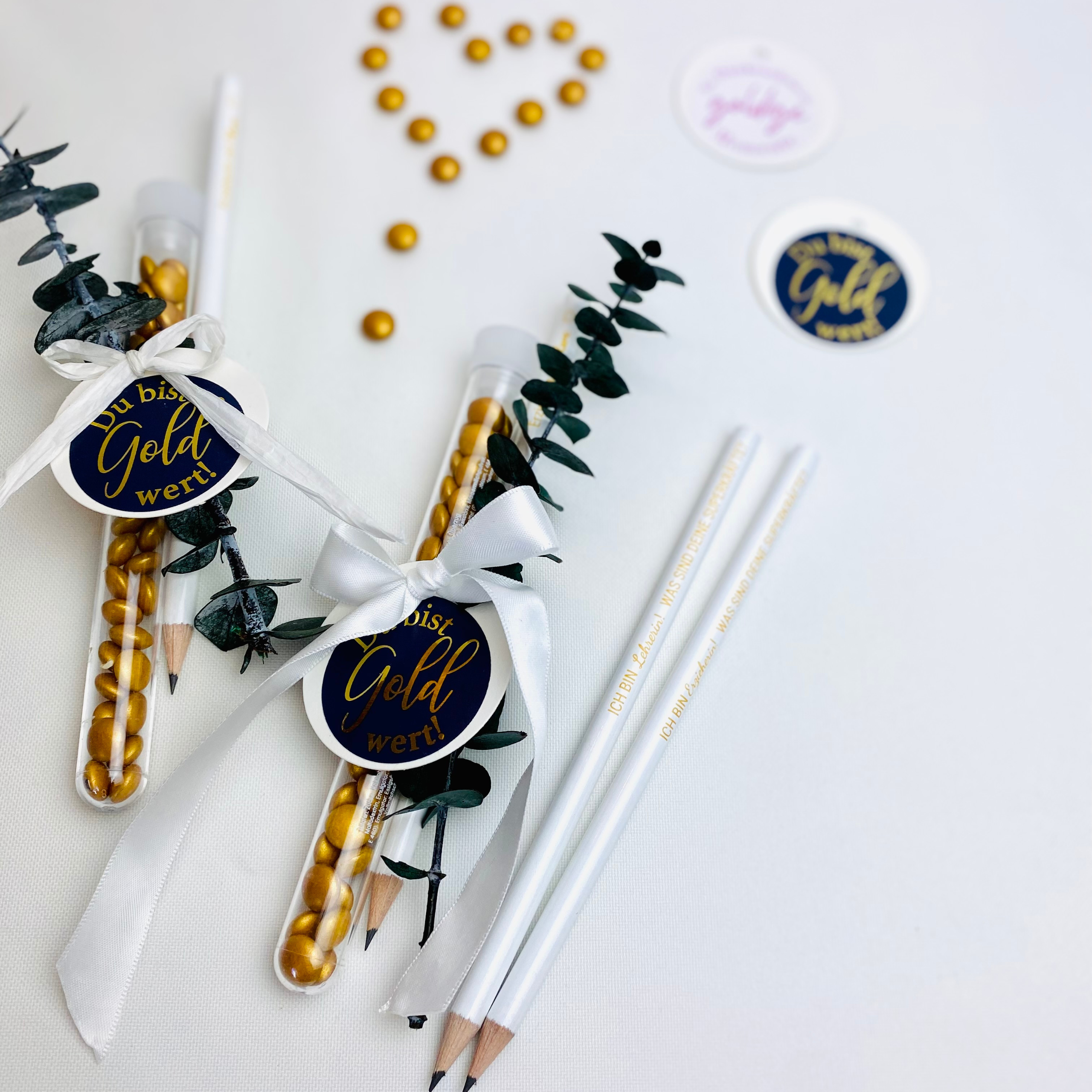 Die goldenen Schokolinsen im Kunststoffröhrchen sind eine köstliche Schokonascherei. Ein Geschenk sollte für die Beschenkte einfach zu genießen sein.